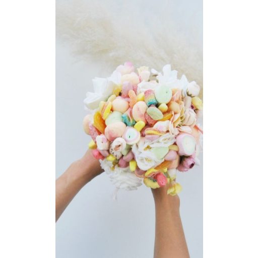 A csokor 60 db cukorpálcát tartalmaz, változatos finomságokkal és prémium minőségű selyemvirágokkal.